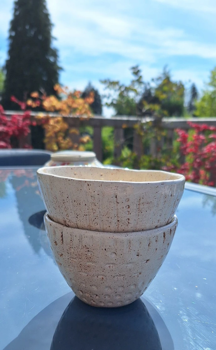 La rosée sur les feuilles, le premier rayon qui réchauffe la terre. La collection Matin doux est née de ces instants magiques. Chaque pièce en grès, unique et façonnée à la main, porte en elle la douceur d'un jardin qui s'éveille — à saisir entre vos paumes au fil des matins.